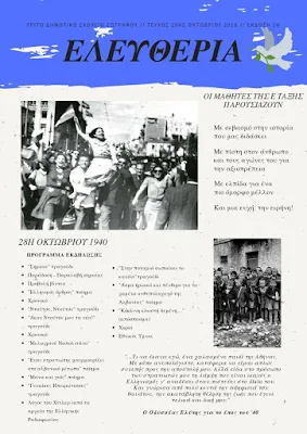 Με μια ζεστή γιορτή που ετοίμασαν οι μαθητές της Ε΄ τάξης με τη φροντίδα των δασκάλων κ. Βούλας Πατελάκη, Ρούλας Τζήκα, Παπαδοπούλου Μαρίας και Γεωργίου Μαίρης, θα θυμηθεί το έπος του '40 η σχολική μας κοινότητα και φέτος. Σας περιμένουμε την Παρασκευή 26 Οκτωβρίου στις 8.15 το πρωί στην αίθουσα εκδηλώσεων να παρακολουθήσουμε όσα έχουν να μας πουν και να δώσουμε όλοι μαζί το παρόν σε μια μέρα που η ιστορική μνήμη συναντά την ελπίδα για ένα καλύτερο μέλλον!